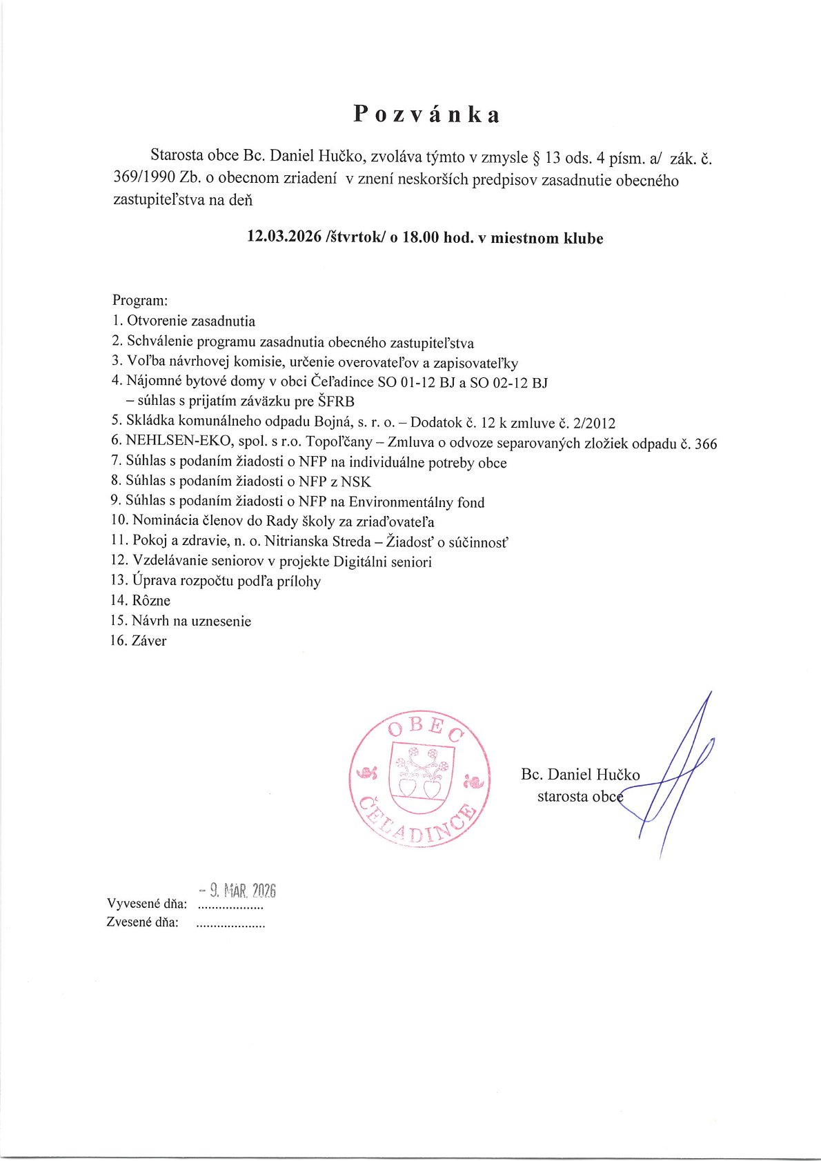Dátum a Čas 12. mar 2026 18:00 – 19:00 Miesto Klub pri KD Kategória Zasadnutie obecného zastupiteľstva